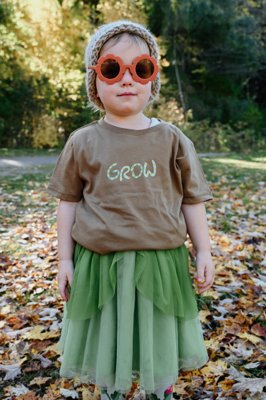 Shows: Child wearing a brown tee Willow & Fern Co. shirt that says GROW on it. She is wearing a green tutu skirt and standing in the leaves.